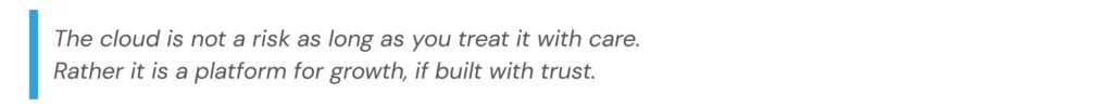 Trust is the real foundation of cloud adoption. It is built not only on secure systems, but on relationships. You need to know someone has your back – someone who will answer your calls, explain things without jargon, someone who shows up when you need, and truly understands your concerns, not just dashboards.