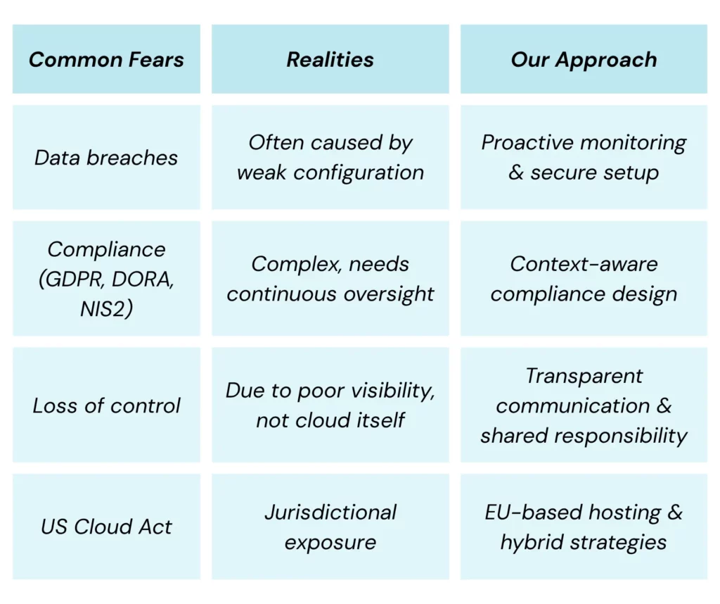 While some risks are real, many are exaggerated or misunderstood. For example, cloud platforms are often far more secure than on-prem setups, if configured correctly.